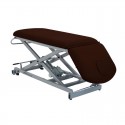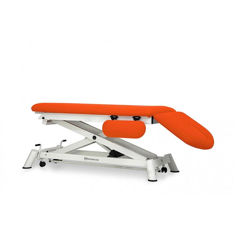 Camilla de reconocimiento eléctrica de 2 secciones con respaldo reclinable en negativo, reposabrazos planos tapizados, portarrollos, tapón facial y ruedas escamoteables.