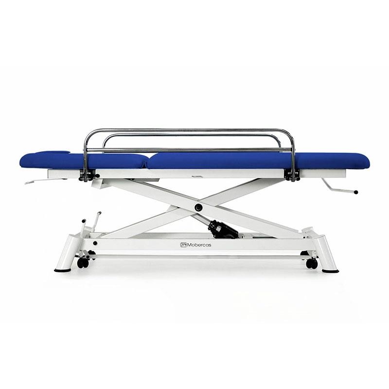Camilla de reconocimiento eléctrica de 2 secciones con subida recta sin desplazamiento lateral, barandillas, portarrollos, tapón facial y ruedas escamoteables.
