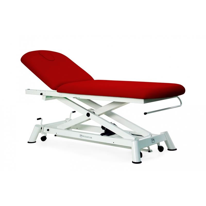 Camilla de reconocimiento eléctrica de 2 secciones con subida recta en tijera sin desplazamiento lateral, portarrollos, tapón facial y ruedas escamoteables