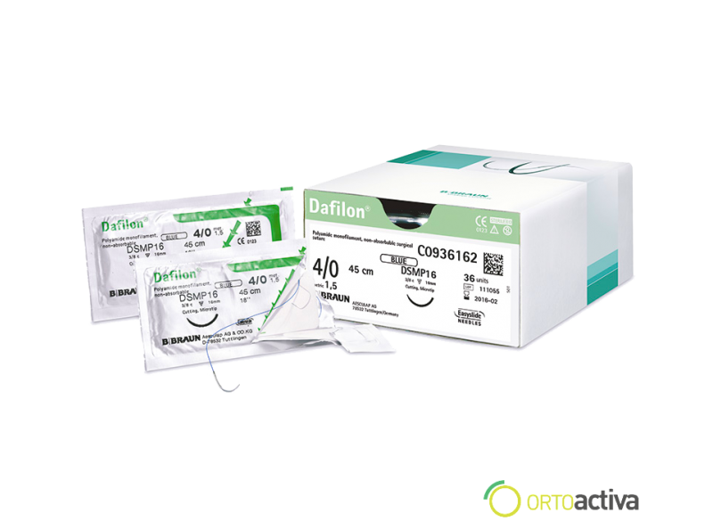 DAFILON BLUE 4/0 DS-19 90 cm. es un material médico utilizado en procedimientos quirúrgicos. Está compuesto por un hilo de sutura de poliamida, que es un material biocompatible y absorbible, lo que significa que se descompone en el cuerpo con el tiempo. Este producto es de alta calidad y cumple con los estándares de seguridad y eficacia requeridos en el campo de la medicina.