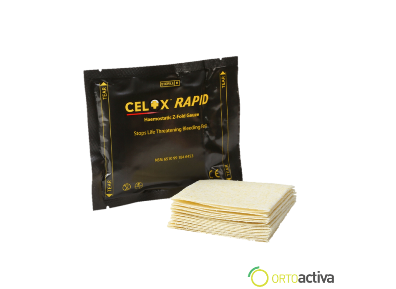 La venda hemostática Celox Rapid es un producto médico diseñado para detener rápidamente el sangrado en heridas y cortes. Está fabricada con un material especial que promueve la coagulación de la sangre, lo que ayuda a detener el sangrado de manera efectiva.