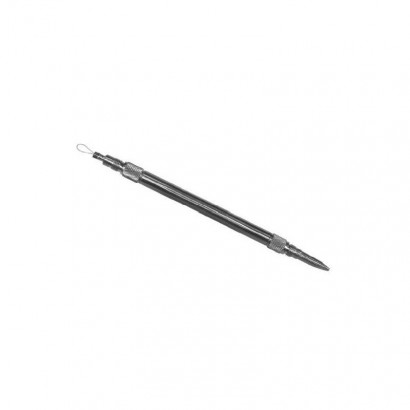 Extractor de cuerpo extraño ocular que consta de un tubo central de metal, una punta de metal magnético y una punta de metal con un lazo de nylon.