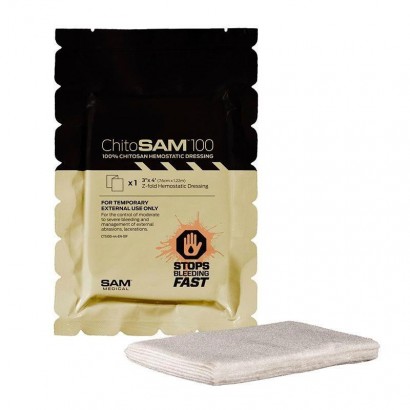 Utilizado por profesionales de la emergencia y fuerzas de seguridad ChitoSAM 100 detiene hemorragias de leves a severas rápidamente. Es efectivo incluso en sangre con anticoagulantes. Apósito plegado en Z de 7,5 x 120 cm