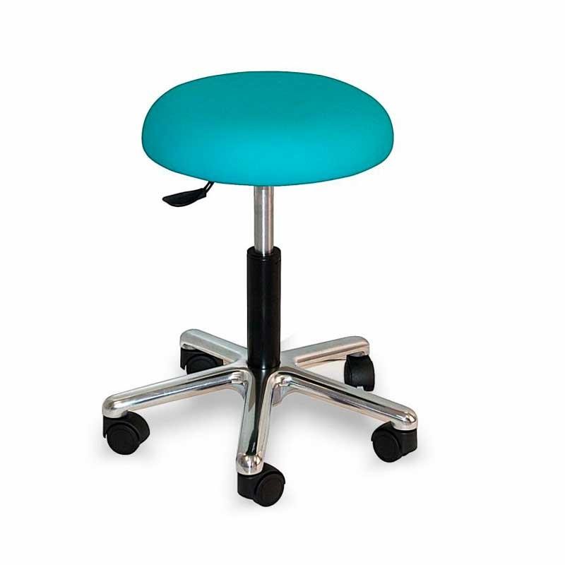 Taburete Redondo con ruedas, regulable en altura. Asiento cómodo y funcional. Base del taburete cromado. 5 Ruedas. Sin respaldo.